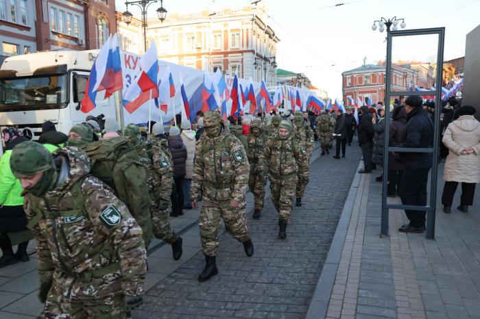 Отправка военнослужащих состоялась с площади Народного Единства, где четыре века назад собиралось народное ополчение во главе с Мининым и Пожарским.
