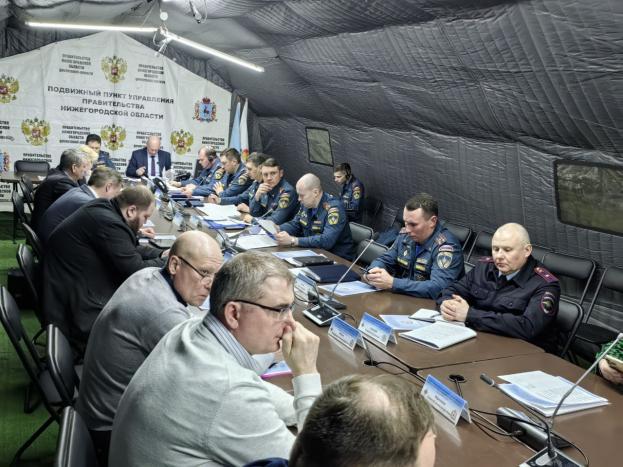 Подвижный пункт управления губернатора Нижегородской области развернут в районе г. Бор. В целях оказания практической помощи администрации муниципальных образований в обеспечении жизнедеятельности населения и ликвидации последствий чрезвычайной ситуации в Балахнинский округ и г.о.г. Бор были направлены дополнительные силы и средства. Для отработки учебных вопросов первого этапа КШУ при выполнении практических мероприятий была задействована группировка сил в составе более 1,5 тысячи человек, привлечено 657 единиц техники, 31 плавсредство.