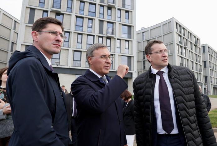Губернатор Нижегородской области представил министру результаты реализации первого этапа строительства кампуса. Валерий Фальков осмотрел 18 первых корпусов общежития кампуса на 1 359 мест. Студенческий городок включает комфортабельные комнаты, зоны для самостоятельных занятий, общественные пространства, подземный паркинг и другую сопутствующую инфраструктуру для обеспечения комфортной жизни студентов.